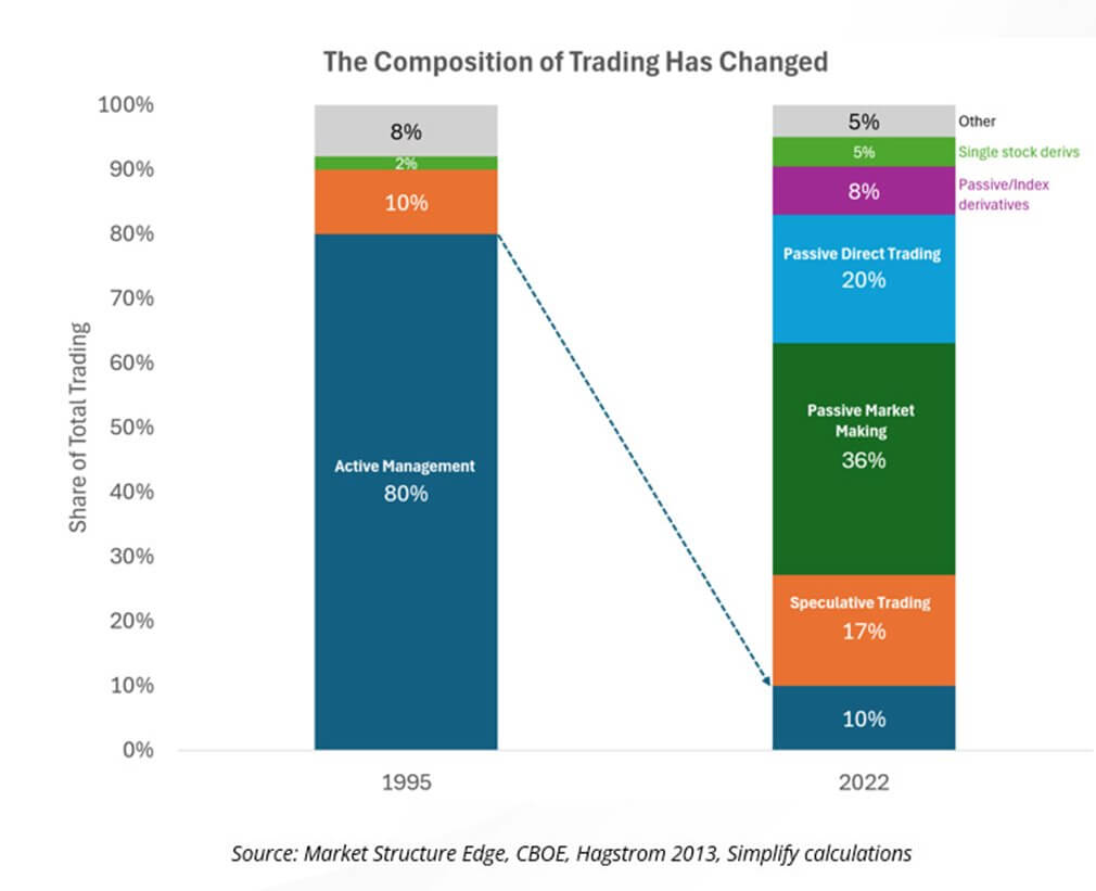 In 1995, active managers accounted for roughly 80% of all stock trading volume.